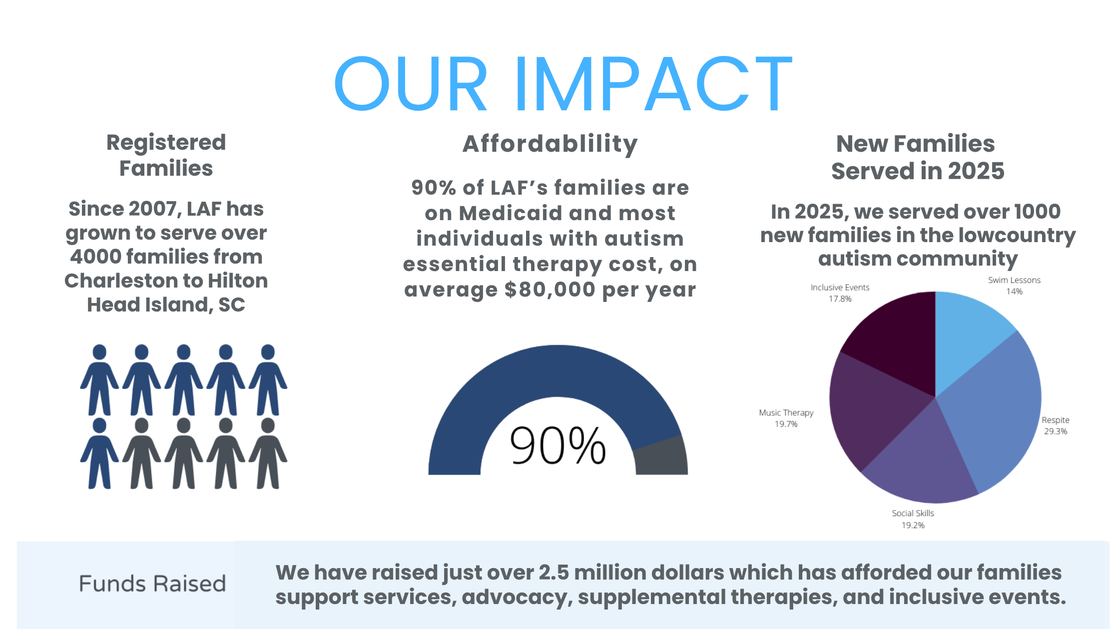 We provide free programs to support a family from the time they suspect their child may have autism, through the diagnosis and throughout their lives. Our programs are individualized and aimed to fill a gap in services. With a very small staff and a dedicated group of volunteers we have provided over half a million dollars in free autism services to over 3,500 Lowcountry families. We are small, but mighty and all of our funds stay right here in the SC Lowcountry.